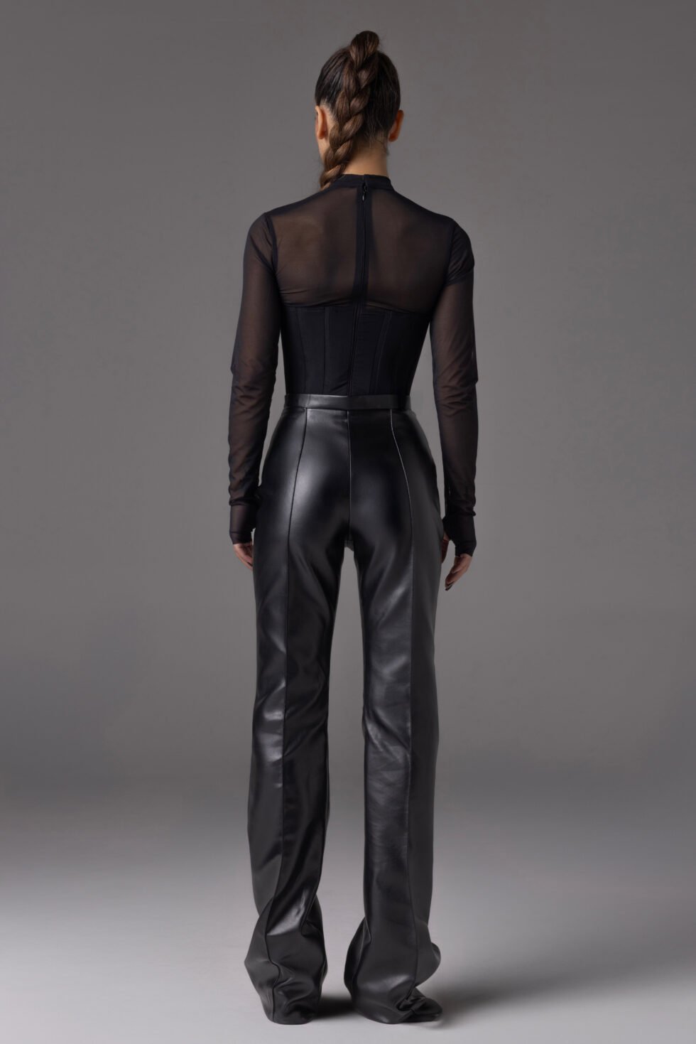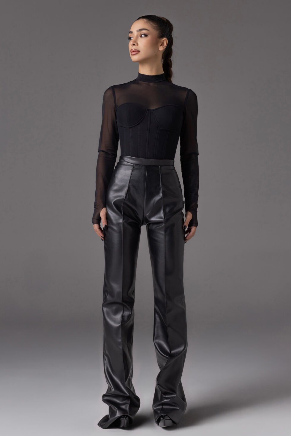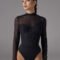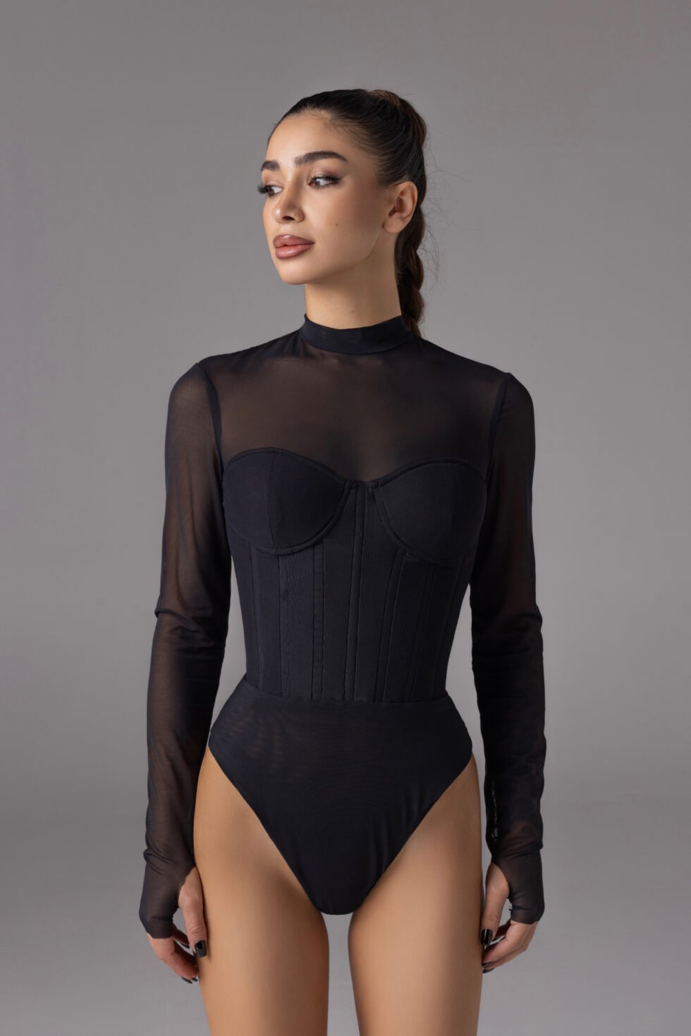 This sheer mesh bodysuit blends modern sensuality with sculptural precision. Designed with a built-in structured corset, it defines the silhouette while maintaining a second-skin feel. The high neckline and long fitted sleeves contrast its bold, contoured shape — creating an elegant tension between coverage and allure. Crafted from delicate stretch mesh with intricate boning details.