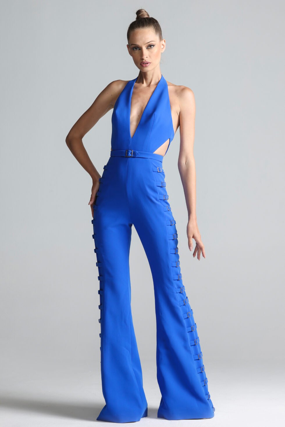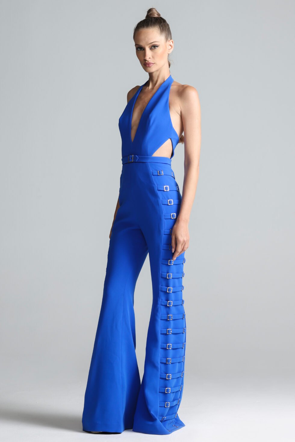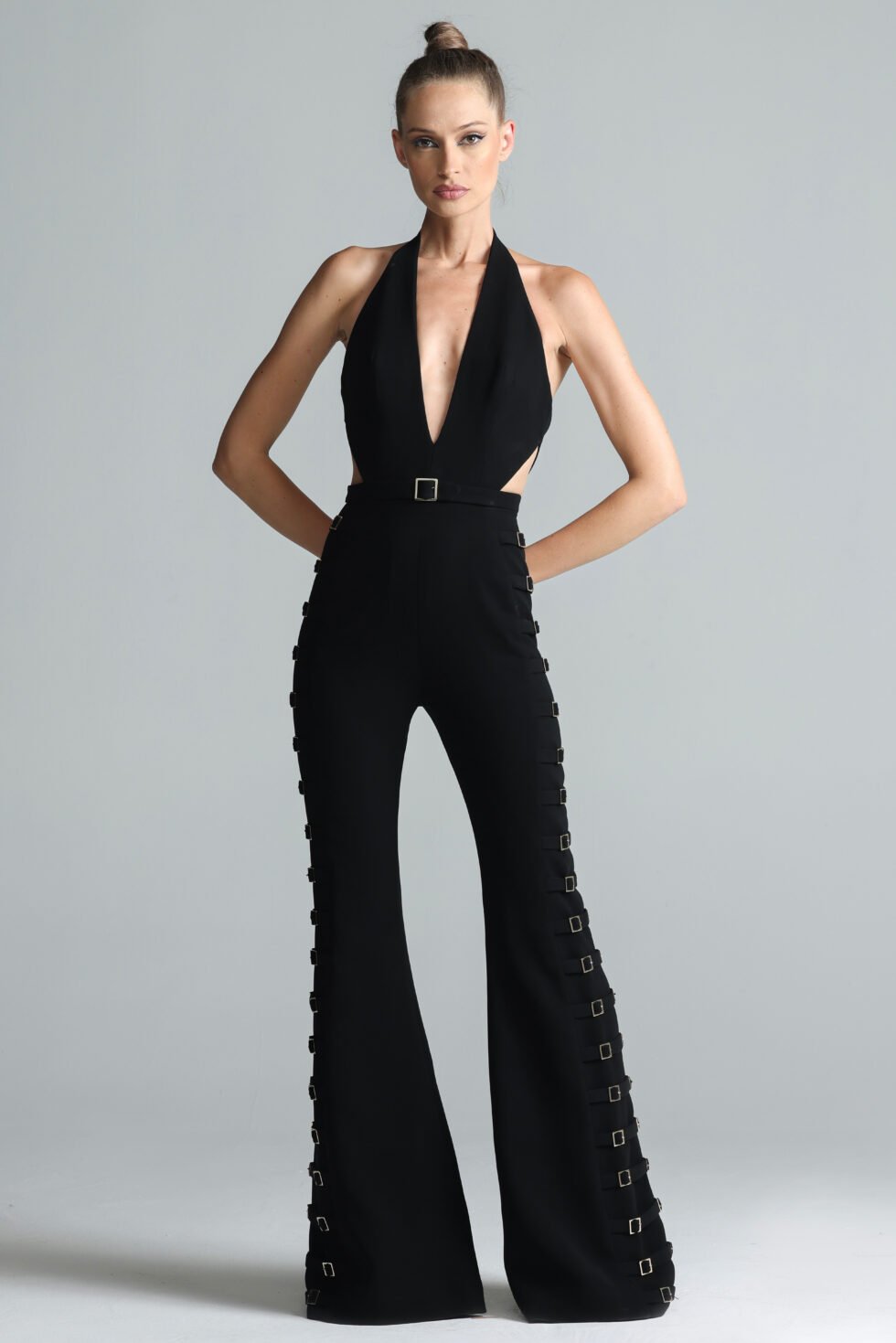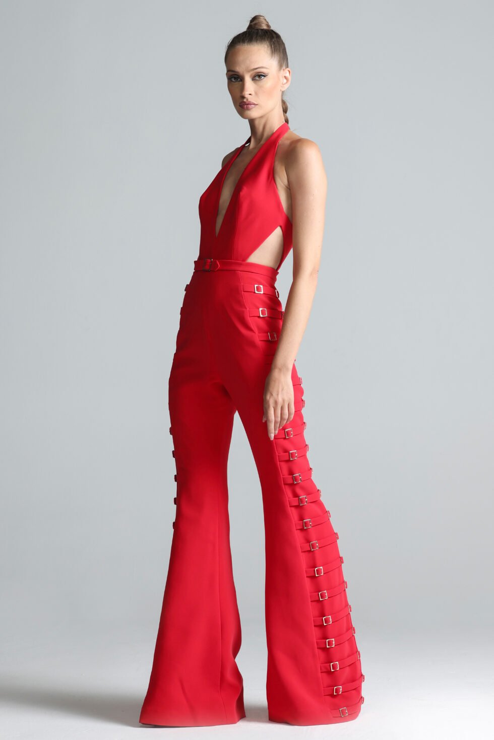 Revealing the Bold Jumpsuit – a fearless fusion of tailoring and statement design, The Bold Jumpsuit commands attention through its sculptural form and striking hardware details. Crafted from structured crepe and lined in tonal satin, the silhouette features a plunging V-shaped neckline and angular cut-outs at the bodice designed to contour and accentuate. The fit is sleek through the torso, extending into dramatic wide-leg trousers with bold volume. Elevating the piece are 38 gold-plated buckle belts along each leg, creating a sense of rhythm and edge. A final belt cinches the waist, while a concealed center-back zipper ensures a clean, tailored finish.
