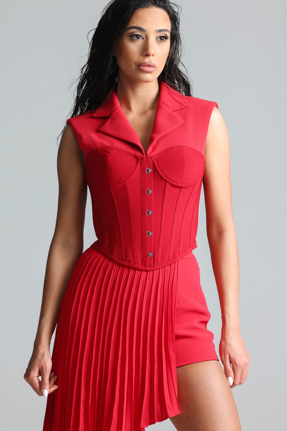 The Diva Top is a sleeveless corset-style blazer, crafted from structured crepe and fully lined in tonal satin for a smooth, luxurious finish. Featuring a rounded V-shaped waist, padded shoulders, and an invisible center back zipper, it sculpts the silhouette with clean precision.