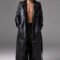 This long black leather coat features a sleek, structured design with statement zipper details tracing the borders. Fully lined with smooth satin, it delivers comfort and luxury on the inside while maintaining an edgy, modern exterior. The lower section of the coat is detachable with a zipper, allowing it to transform into a shorter version for a versatile look. Finished with a leather belt and buckle cuffs.