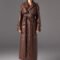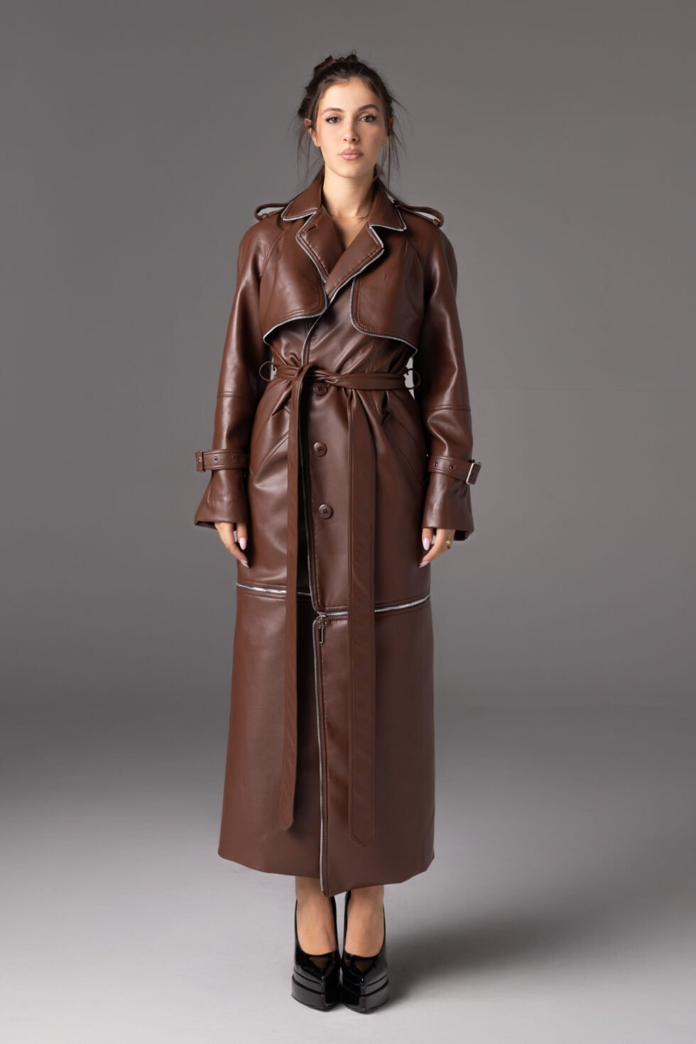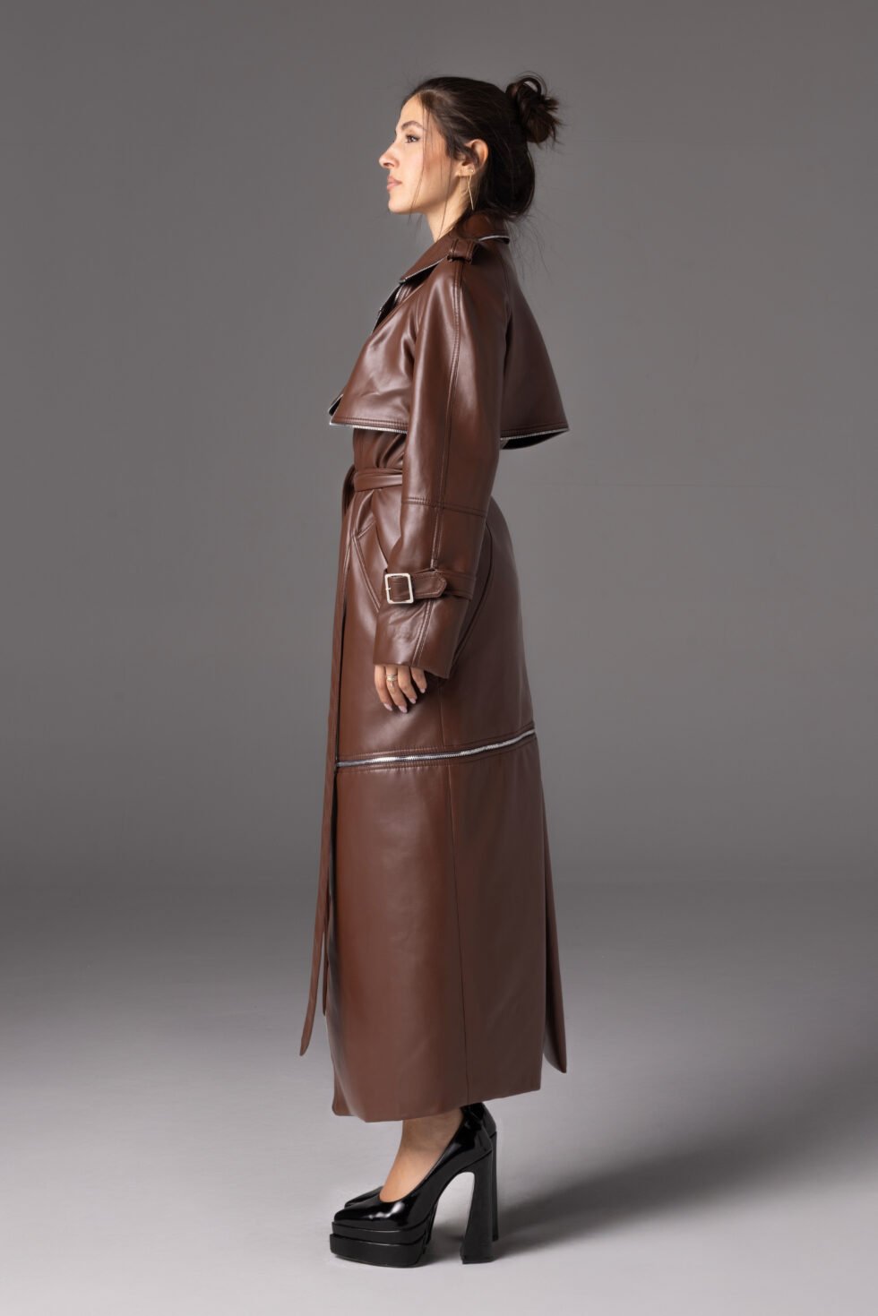 This long black leather coat features a sleek, structured design with statement zipper details tracing the borders. Fully lined with smooth satin, it delivers comfort and luxury on the inside while maintaining an edgy, modern exterior. The lower section of the coat is detachable with a zipper, allowing it to transform into a shorter version for a versatile look. Finished with a leather belt and buckle cuffs