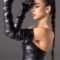These gloves are crafted from leather, extending past the elbows, creating an elongated, sculptural silhouette.