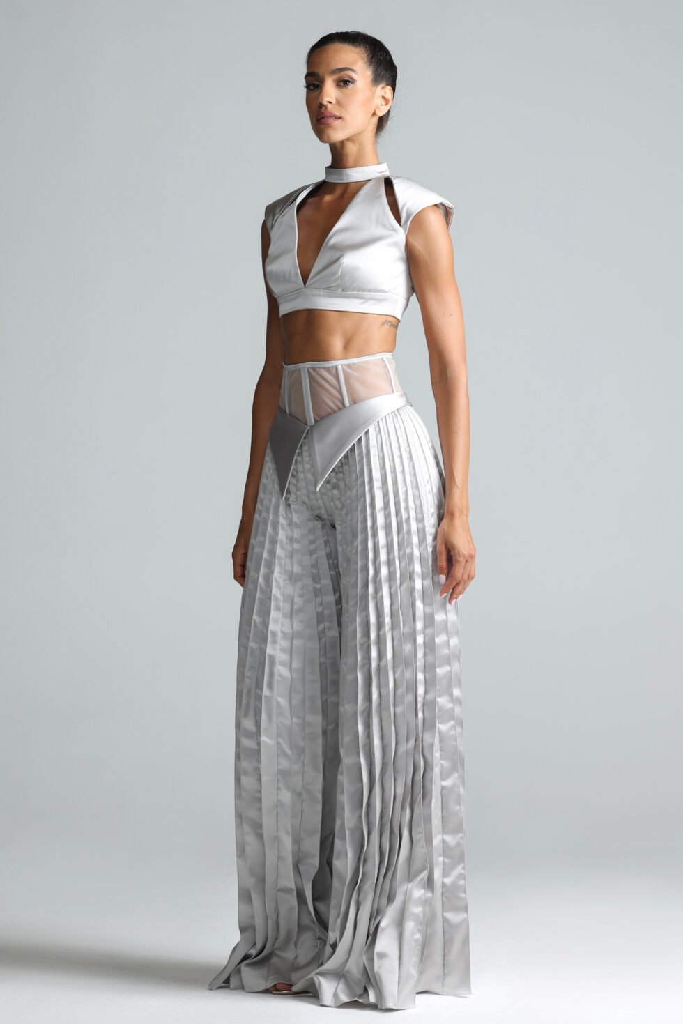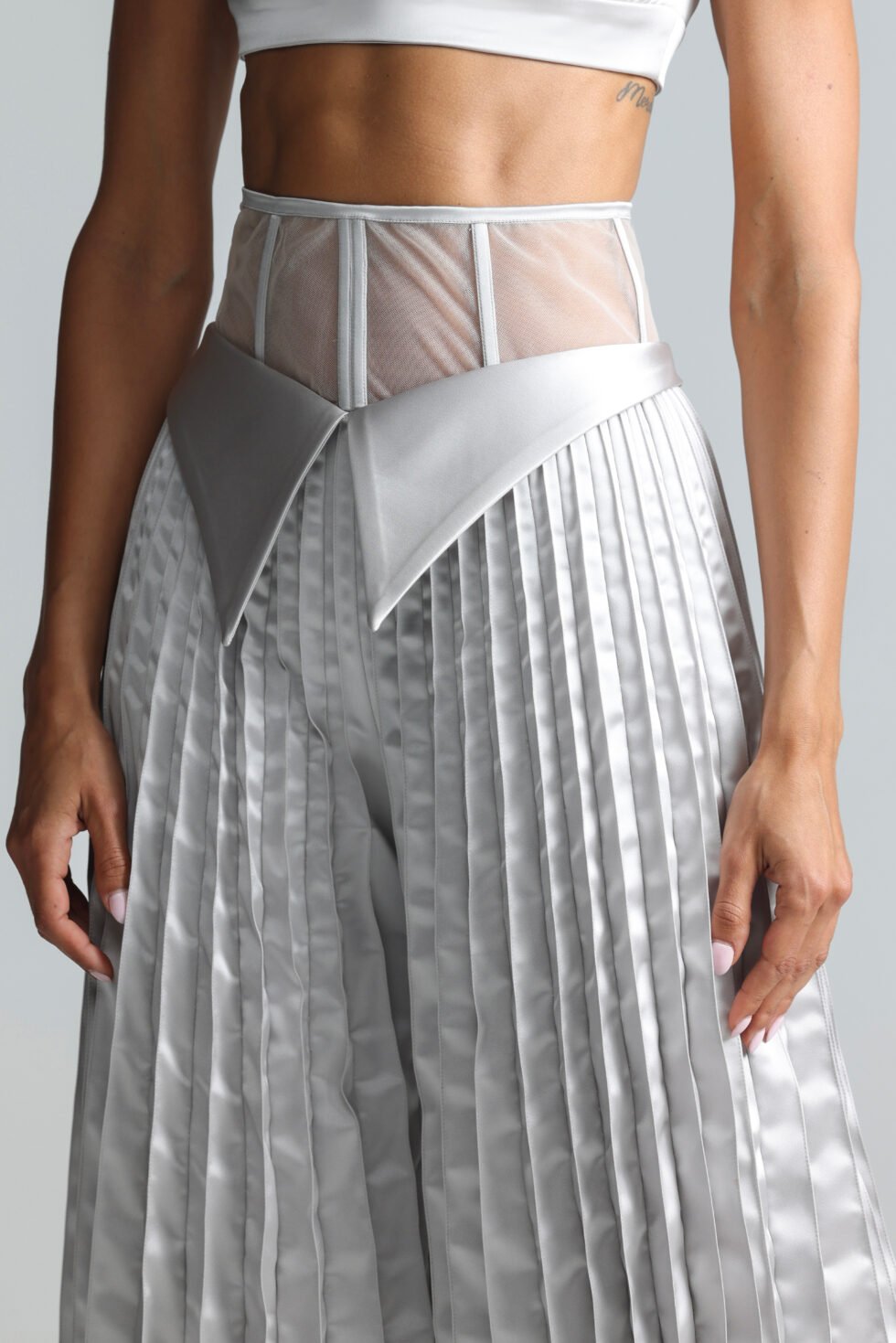 The Power Pants are a cut from our signature pleated satin—meticulously crafted for texture, volume, and graceful movement. The dramatically wide legs are anchored by an integrated corset belt, made from tulle couture and satin cinching the waist with architectural precision. A discreet invisible zipper at the center back completes the look.