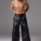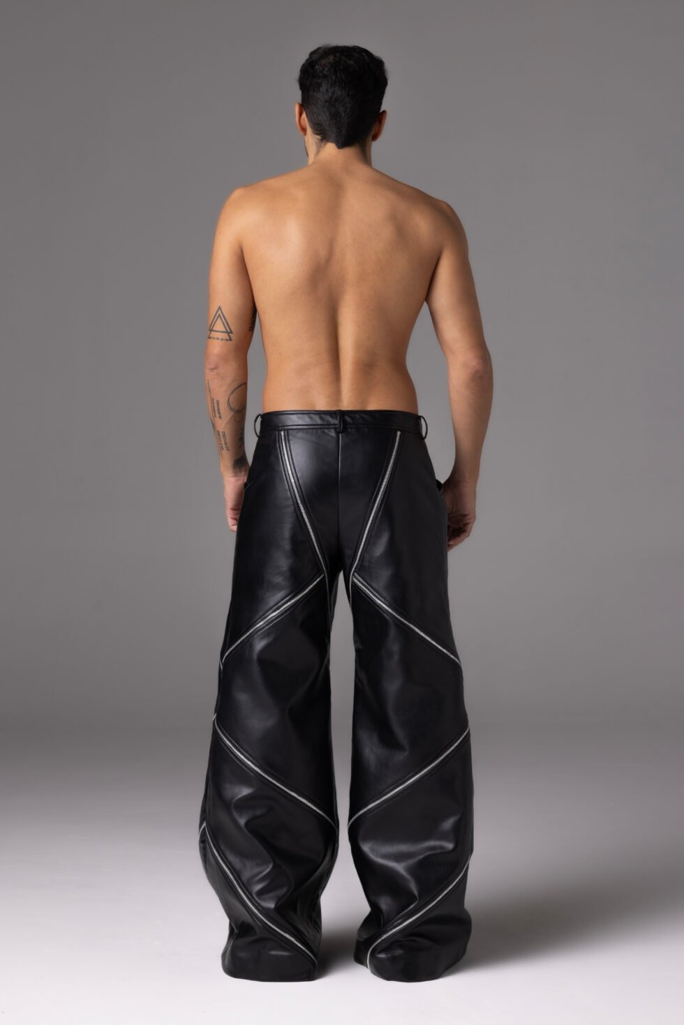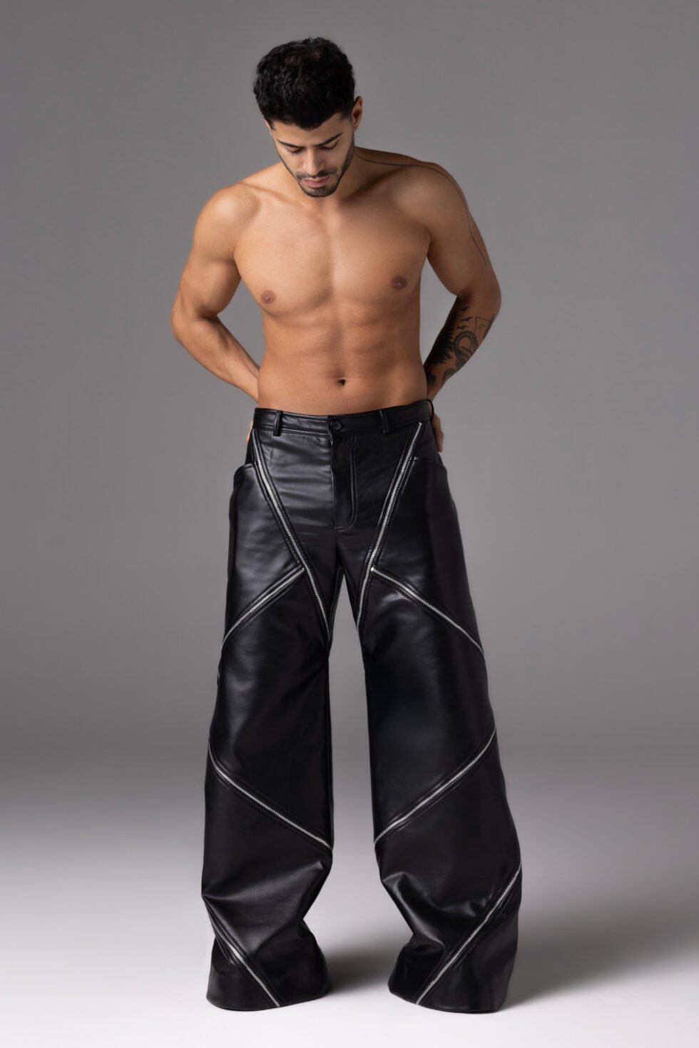 These wide-leg pants are crafted from leather with a smooth satin lining. The design features bold diagonal zipper details that wrap around the legs, creating a sculpted and edgy silhouette. With a structured waistline and oversized shape, these pants combine comfort with statement style.