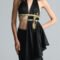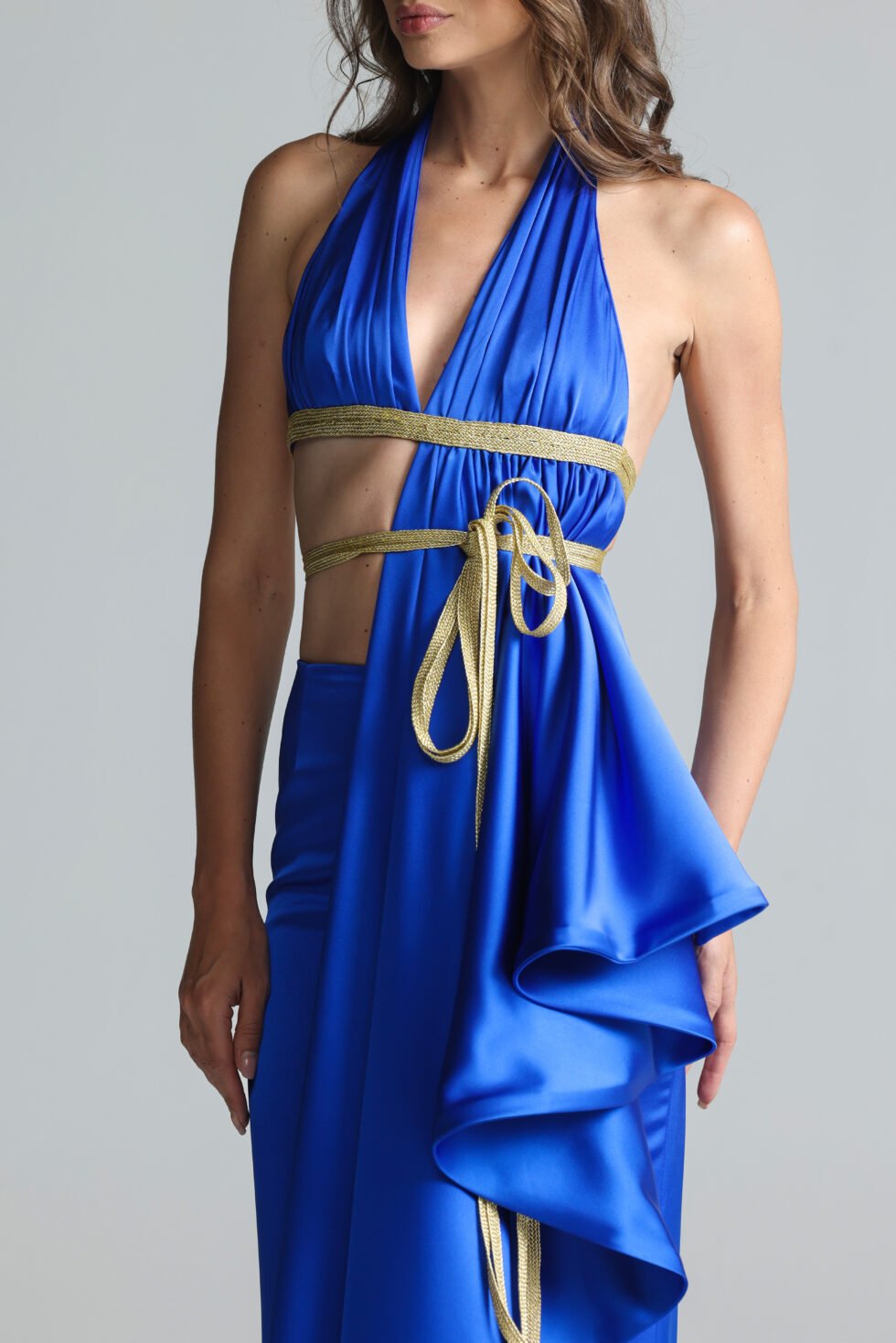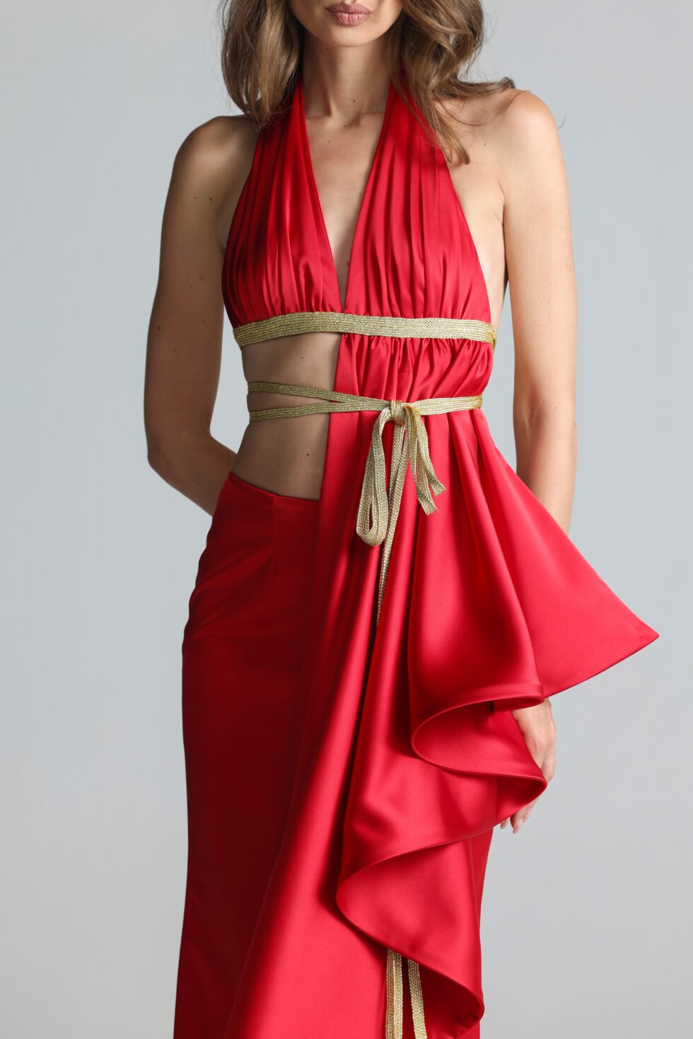 The Serena Top is a cropped satin top features a plunging V-neckline and artful gathering throughout, creating a fluid, body-skimming silhouette. A dramatic, draped satin panel cascades from the left side, adding movement and asymmetry. The open back is framed by a long, gold-toned fabric rope that wraps around the waist and ties in a refined front knot.