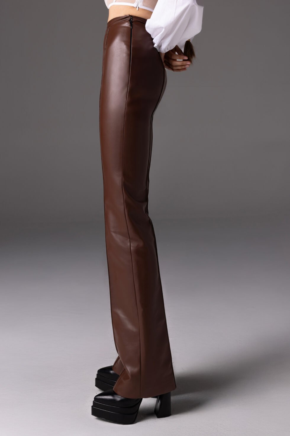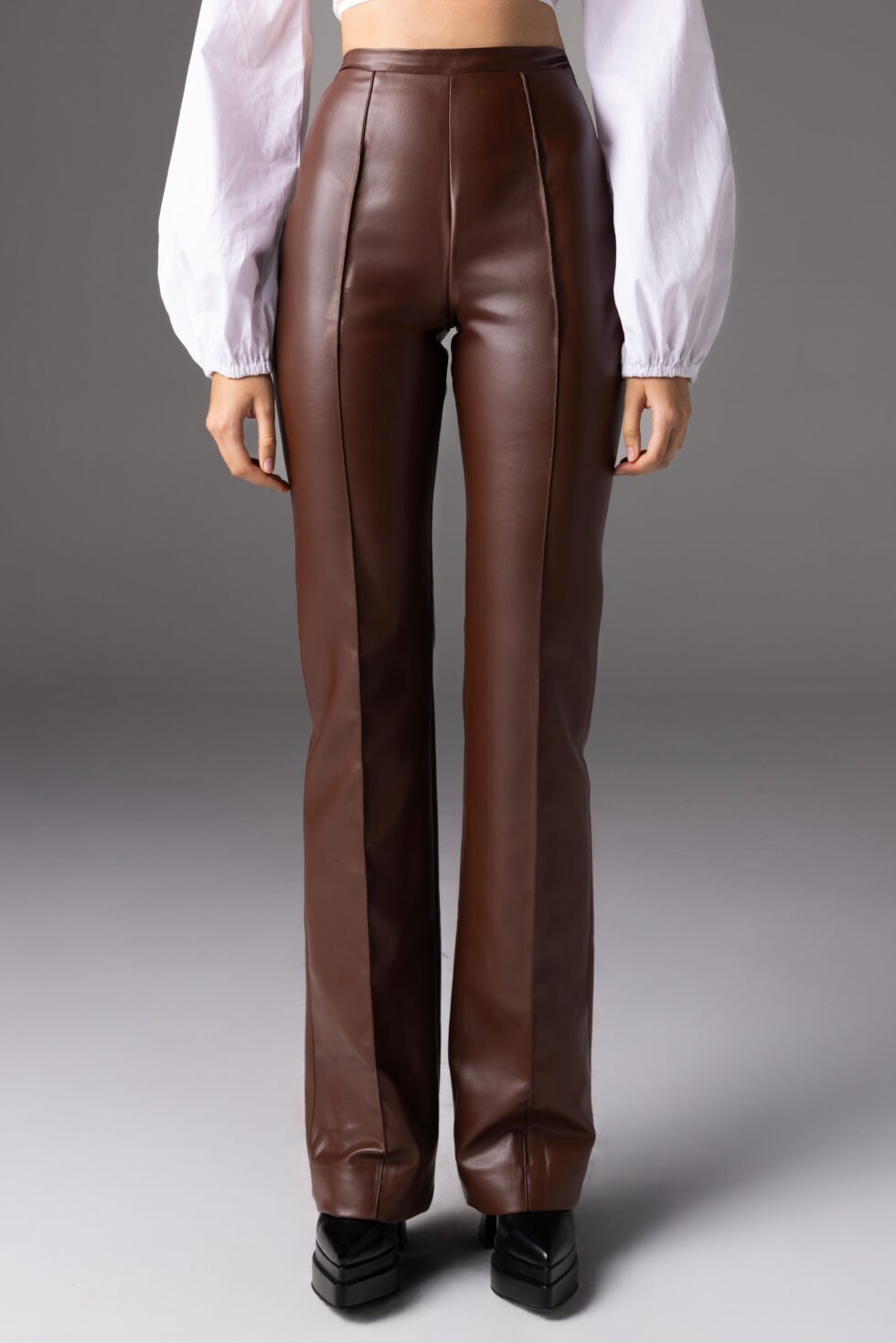 This high-waist leather pants is fully lined in satin. They elongate the silhouette with clean vertical seams and a structured fit that molds elegantly to the body.
