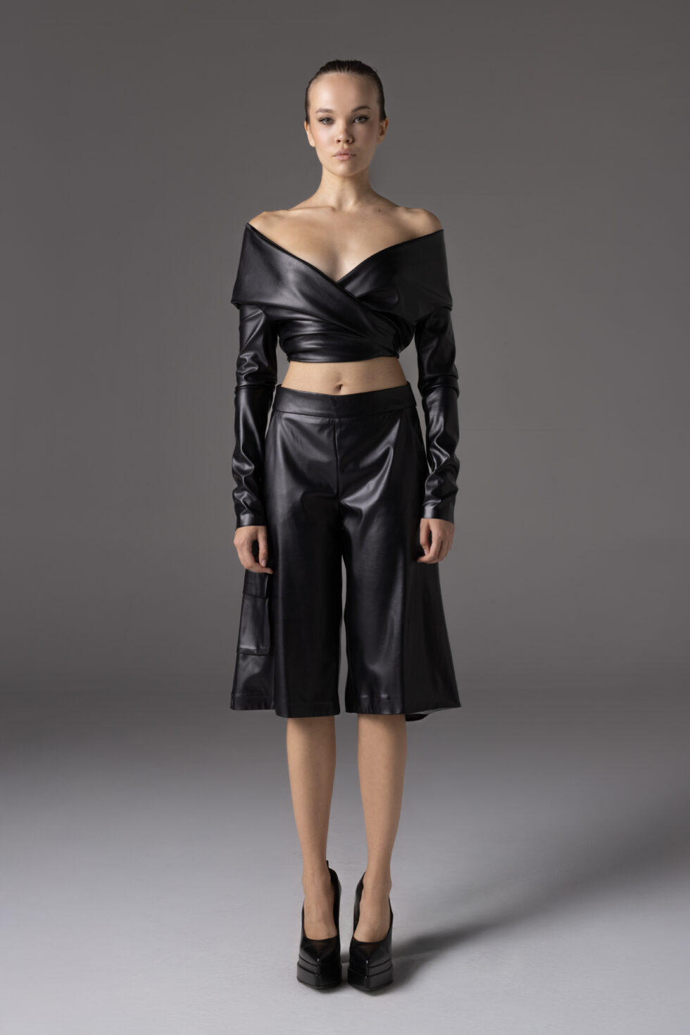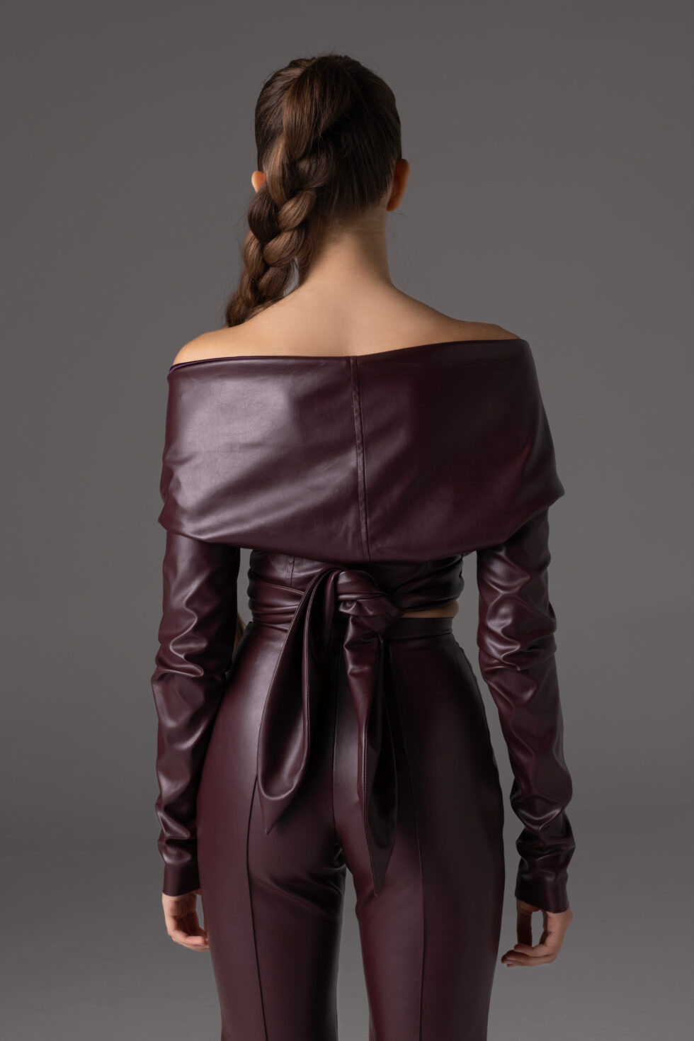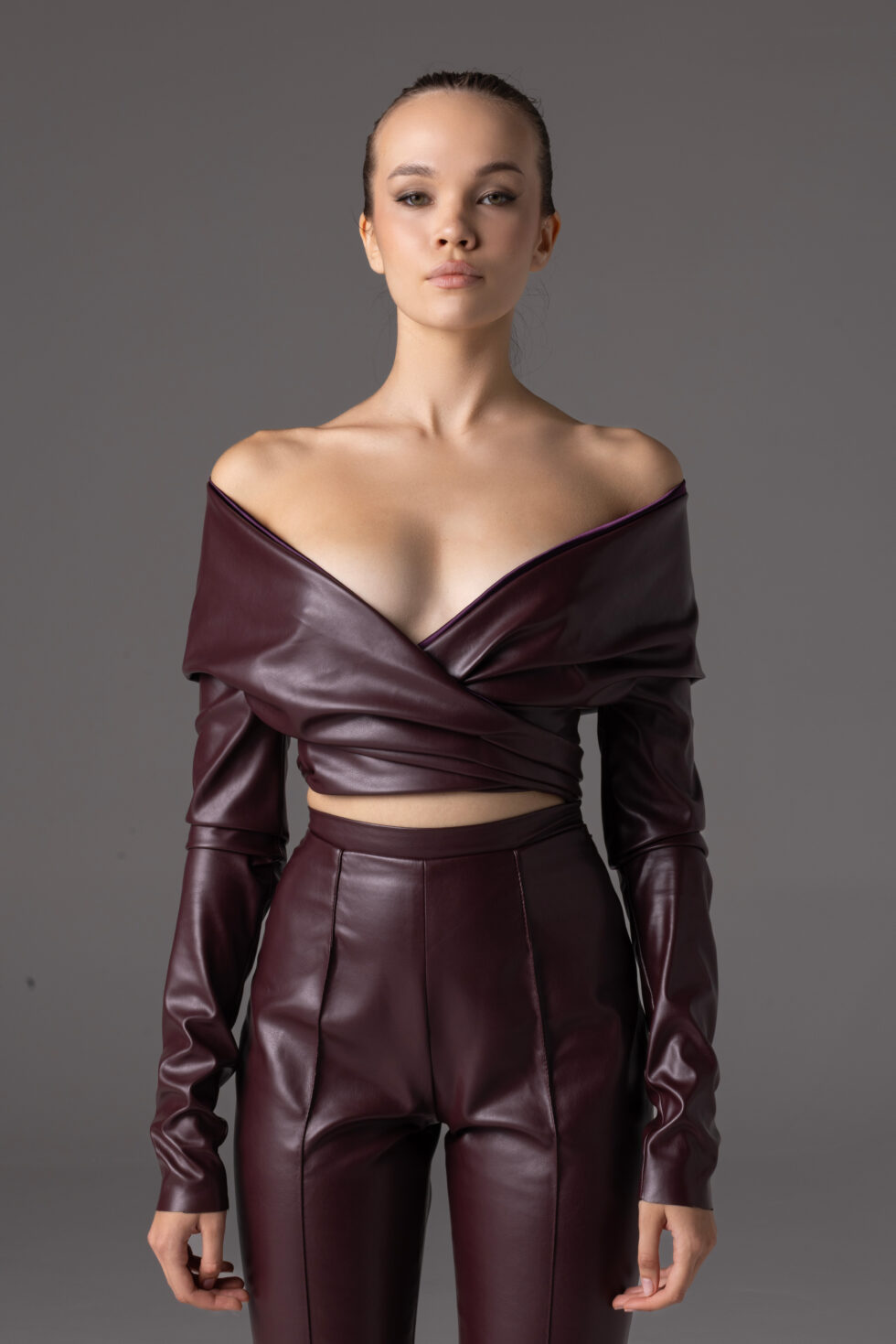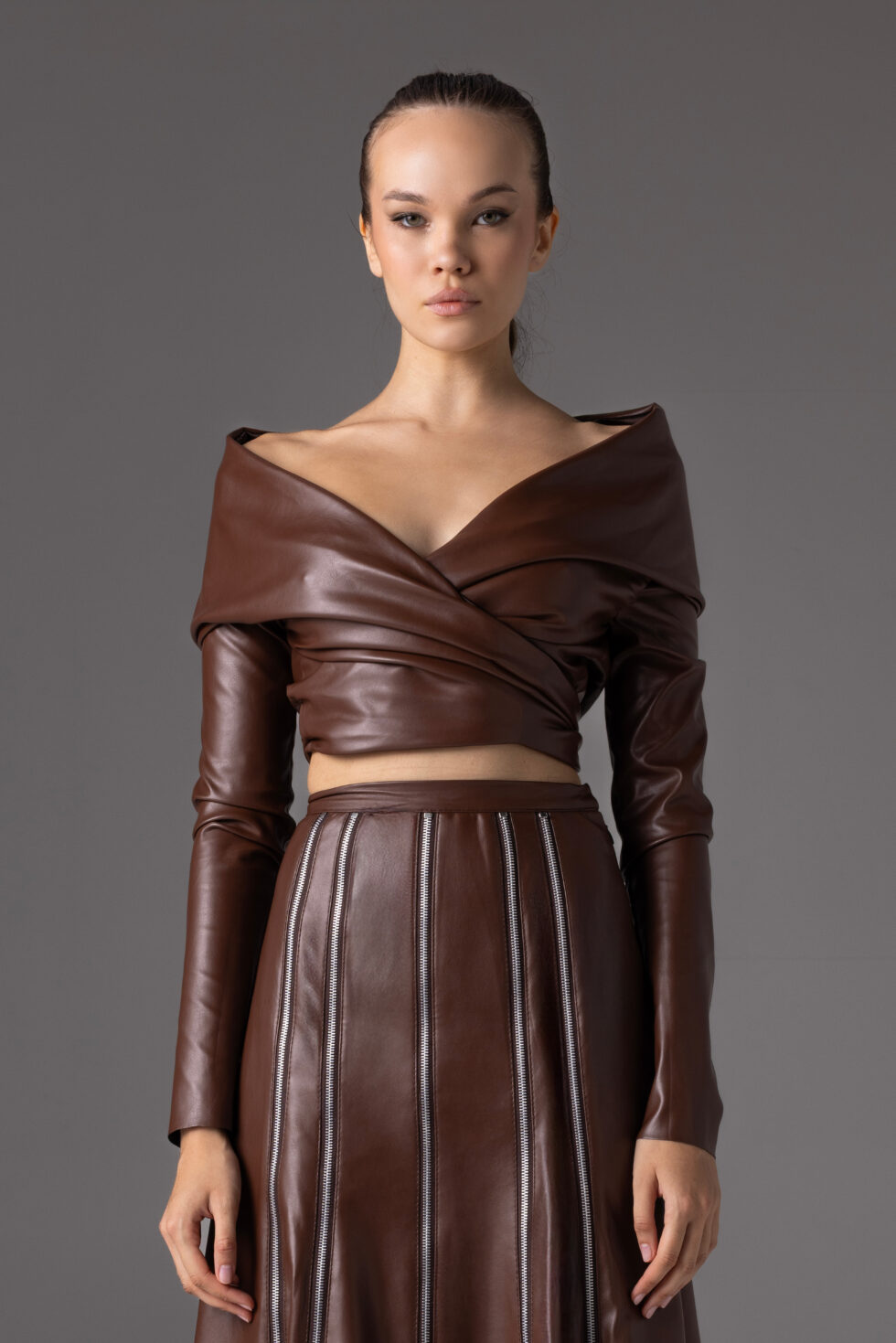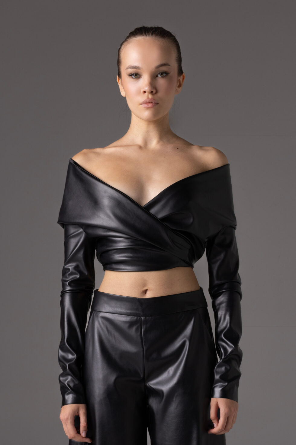 This off-shoulder leather top is fully lined in satin. It wraps elegantly around the body with a sculpted crossover front and an adjustable tie-back. The draped neckline frames the shoulders with effortless allure, while the tailored fit accentuates the waist.