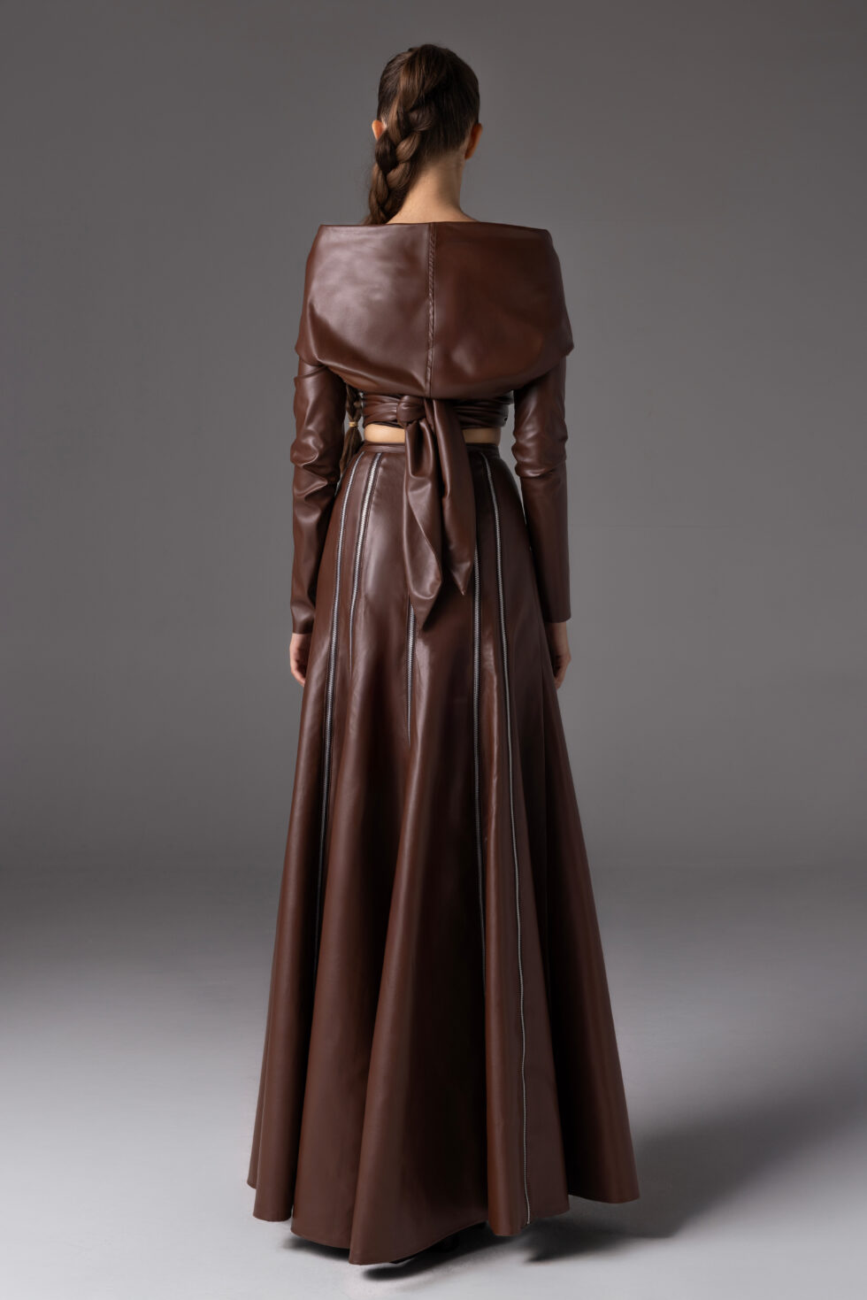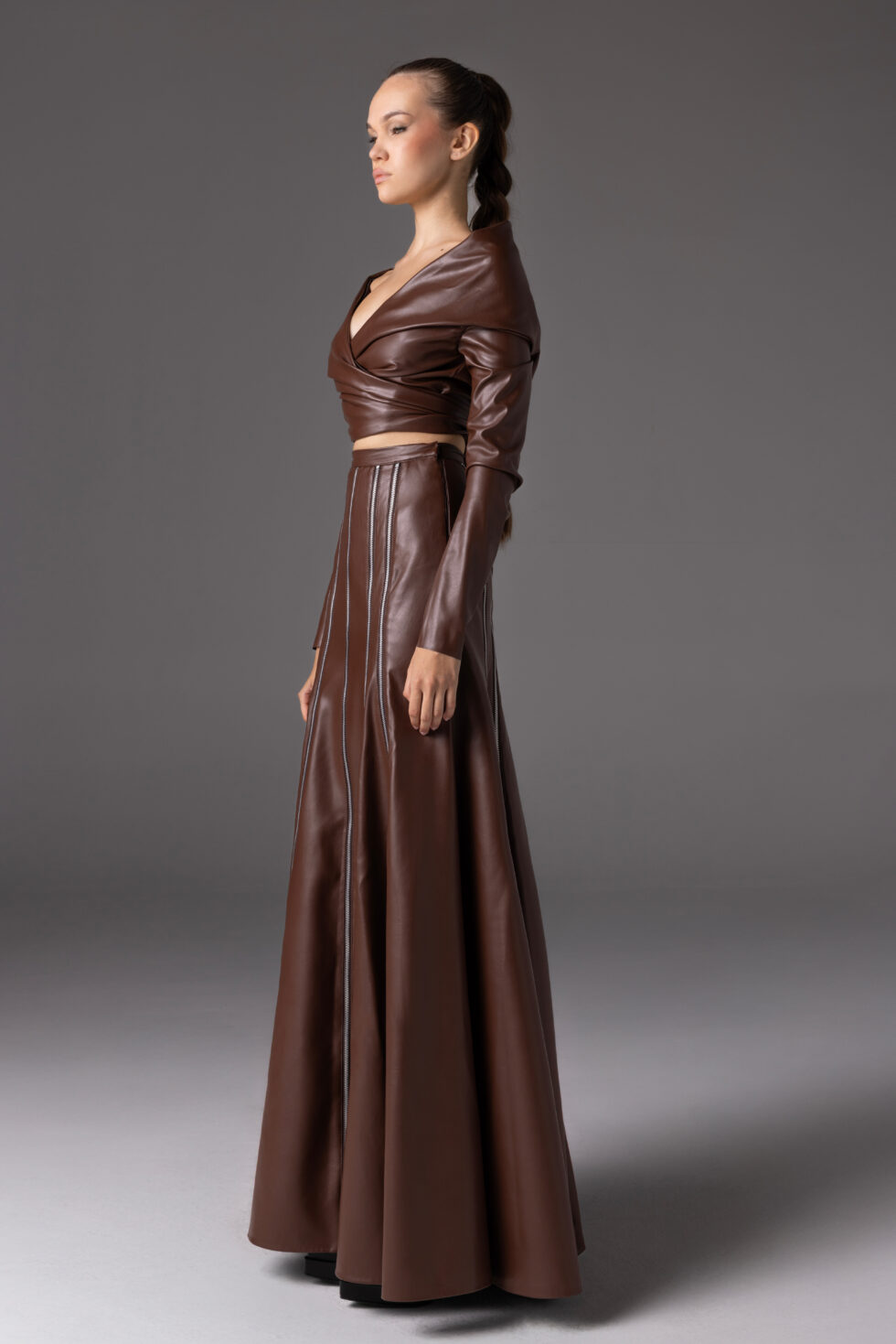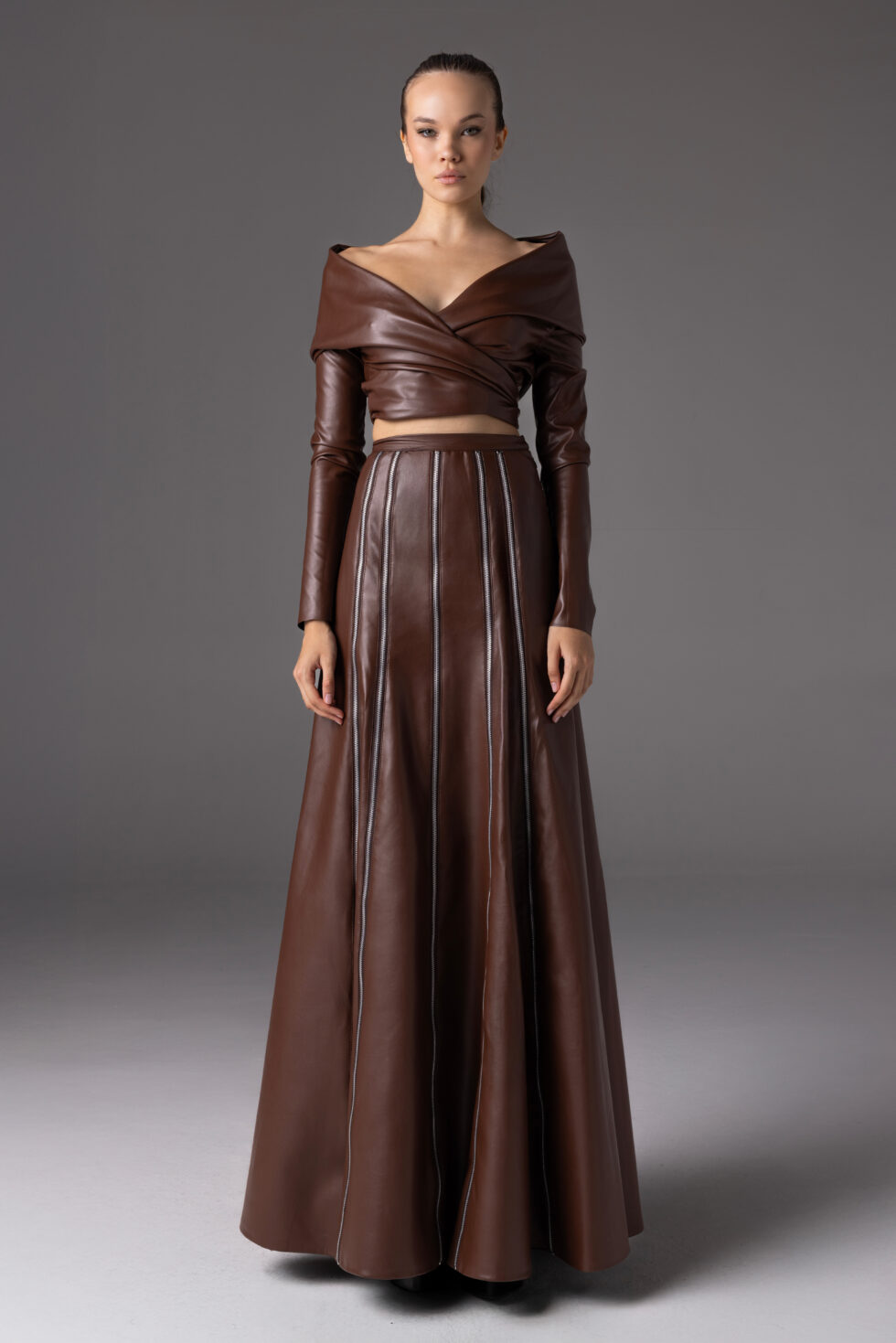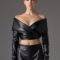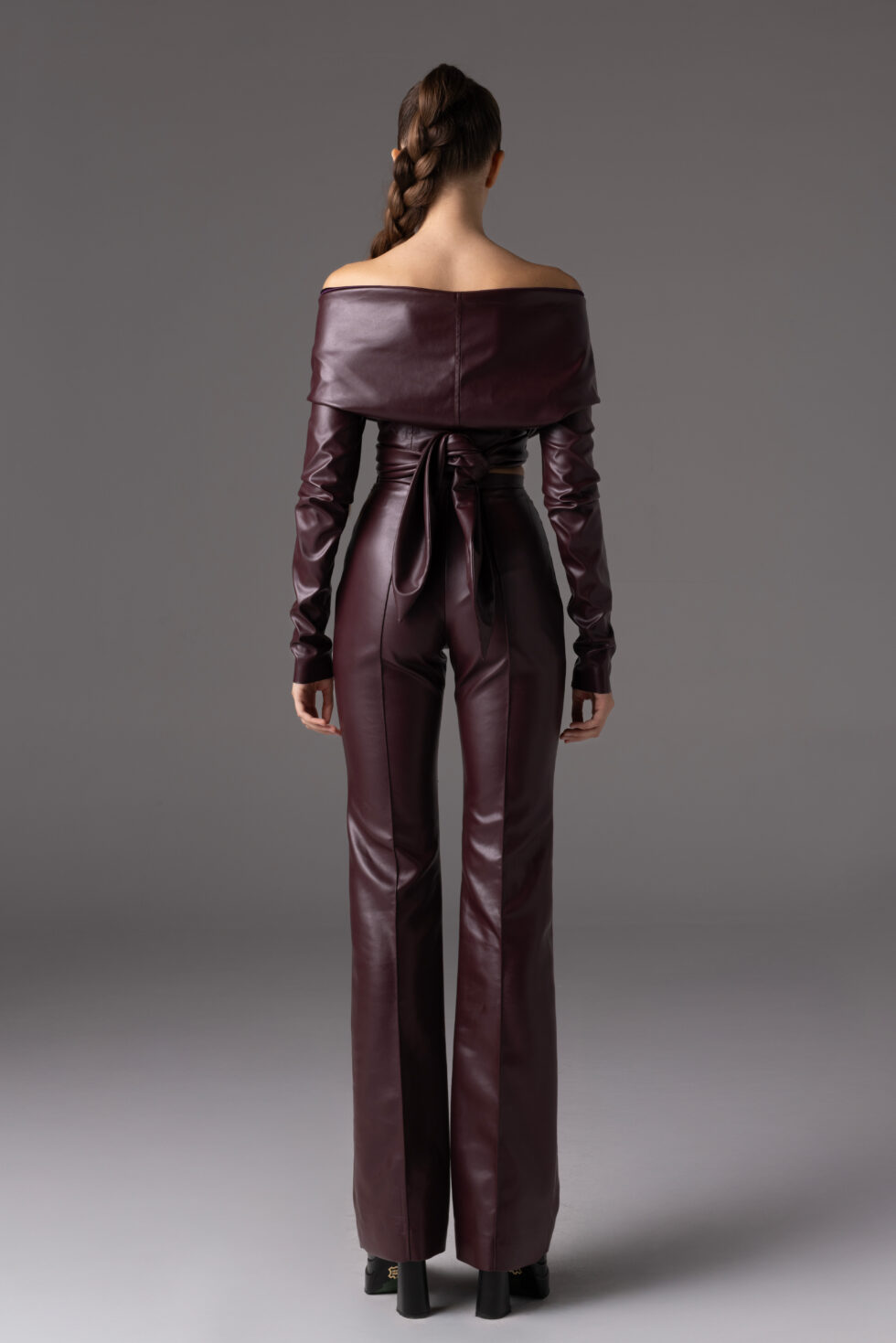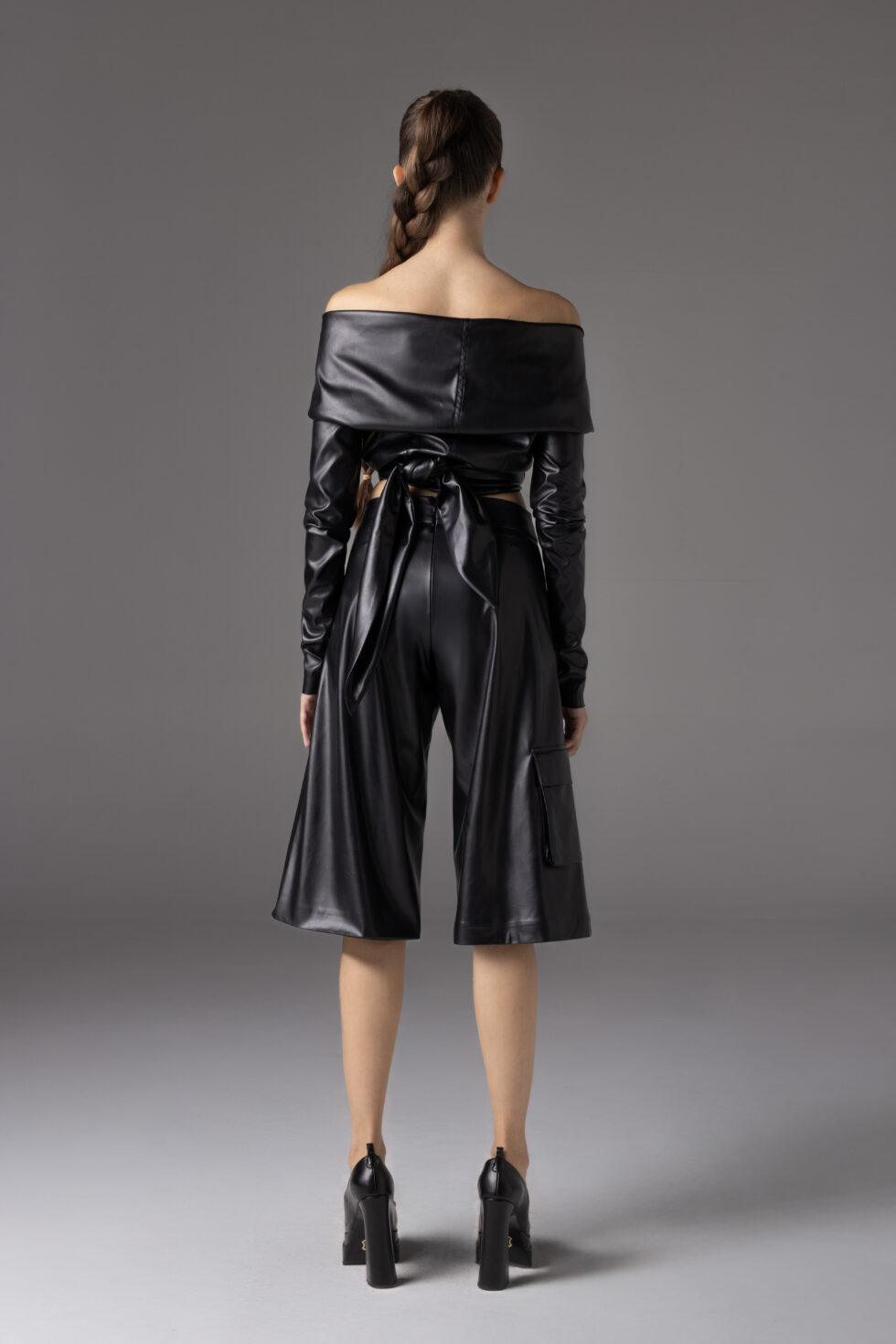 This off-shoulder leather top is fully lined in satin. It wraps elegantly around the body with a sculpted crossover front and an adjustable tie-back. The draped neckline frames the shoulders with effortless allure, while the tailored fit accentuates the waist.