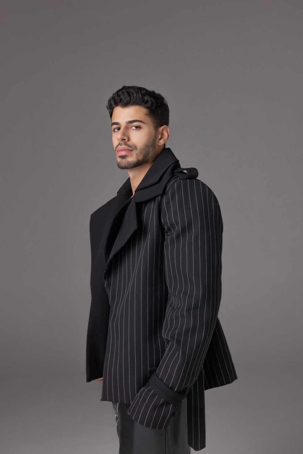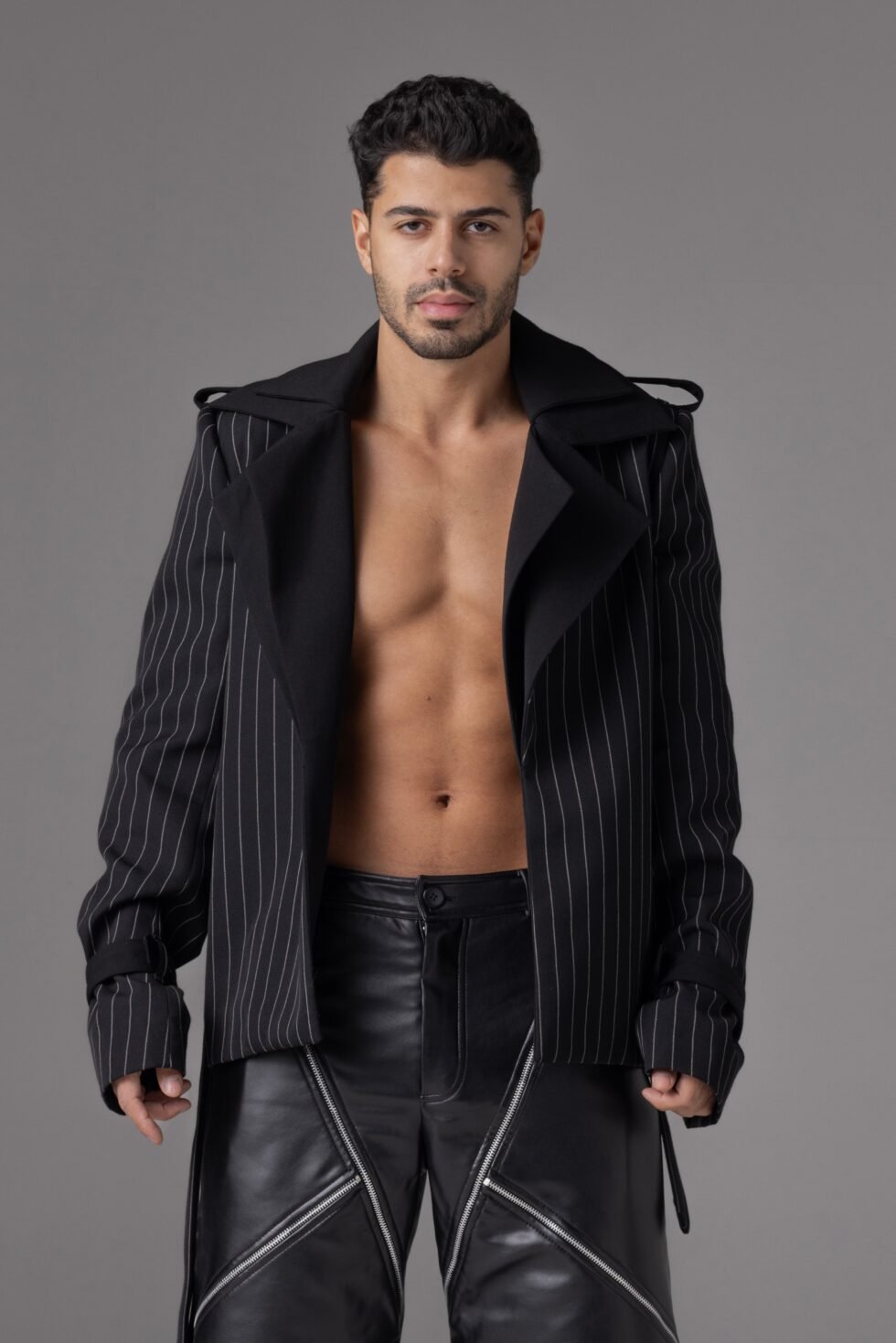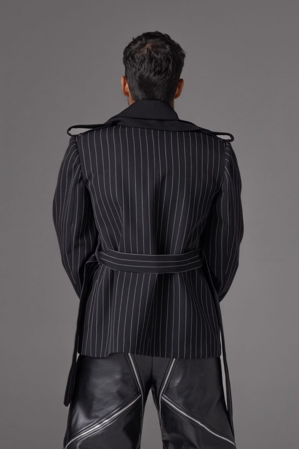 This blazer jacket is made from structured wool with a relaxed yet defined fit. Designed with wide, doubled lapels and subtle pinstripes, it features adjustable buckled cuffs and a belt at the waist for shape control. The shoulders are slightly built for structure. It is fully lined in satin.